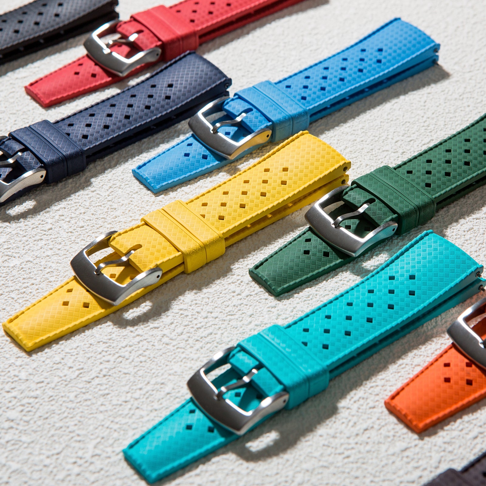 Our straps pay homage to the iconic rally design of 1960s dive watches, featuring finely perforated vents for enhanced breathability, quick-drying comfort, and ideal wear in hot climates.