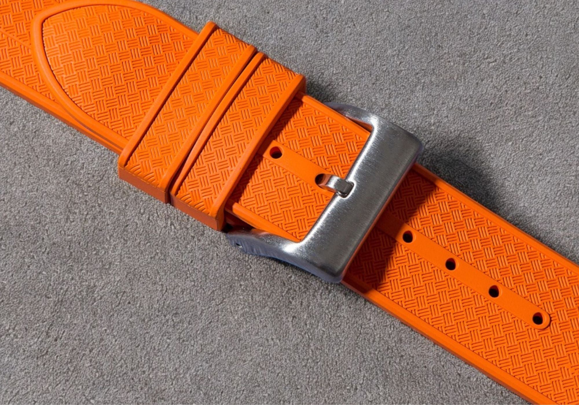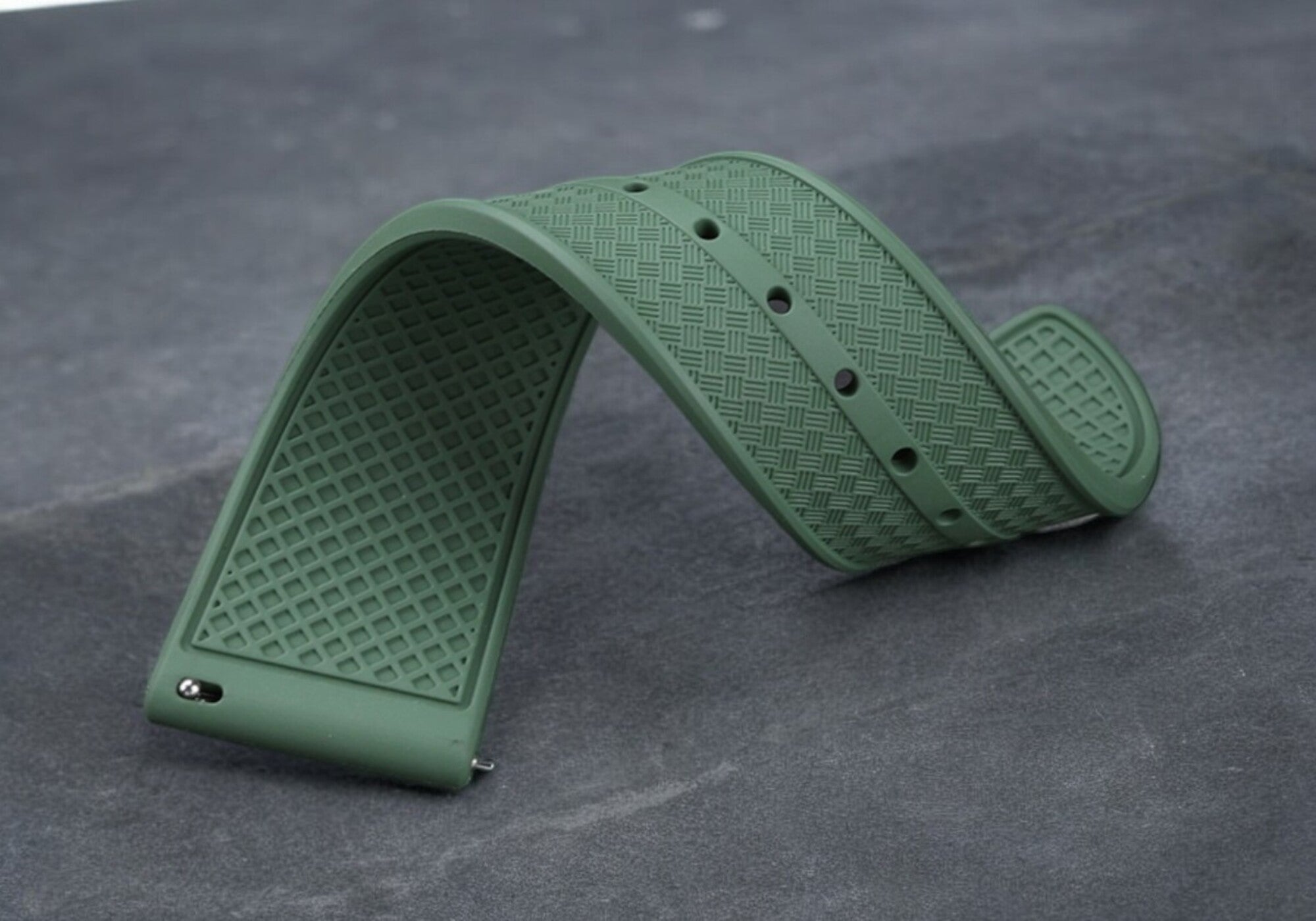 Made from FKM rubber, the highest quality rubber strap material available. FKM rubber's exceptional chemical stability translates to unparalleled durability, resilience, & colorfastness, while its resistance to aging & weathering ensures longevity. Most importantly, it is anti-dust.