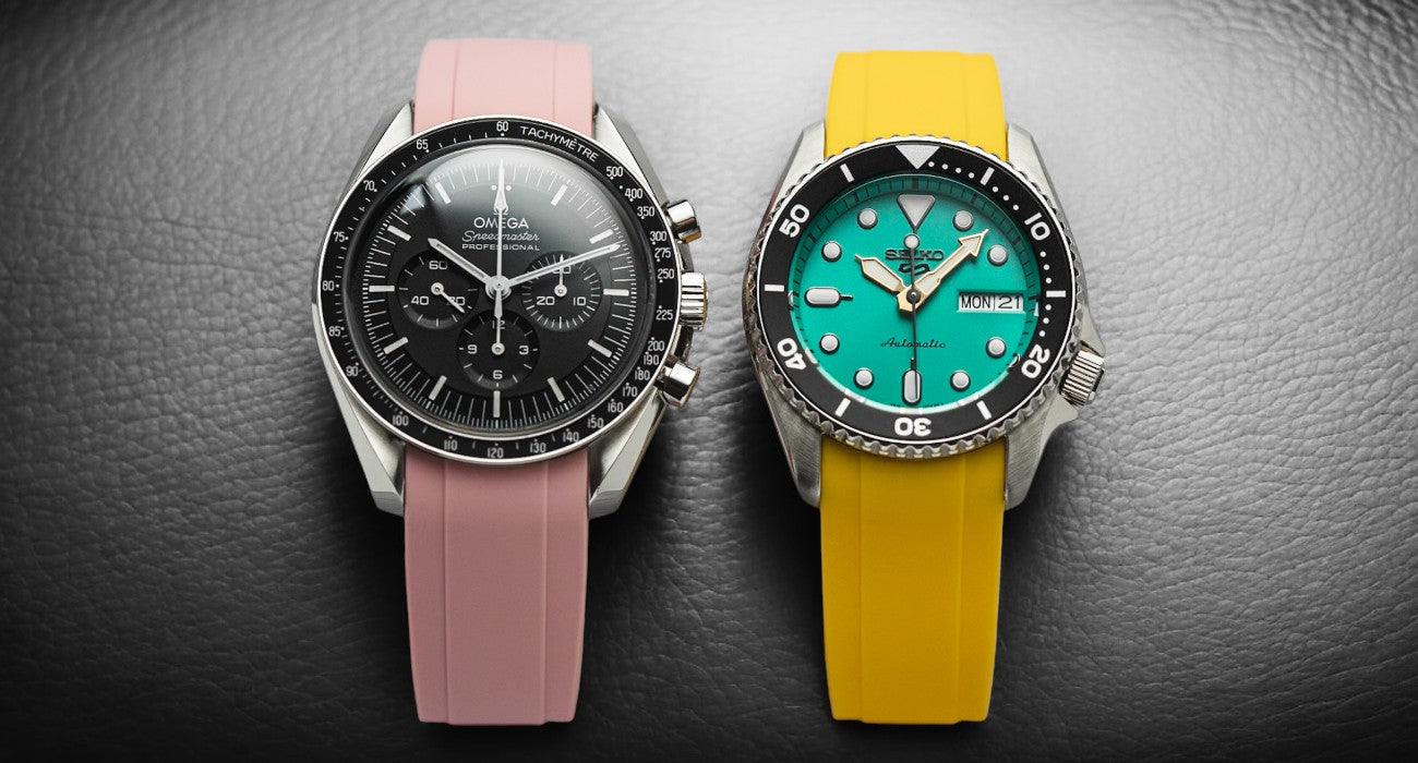 Achieve a seamless, integrated fit with your Omega Speedmaster Moonwatch , Omega x Swatch MoonSwatch, Omega Seamaster 300 or Seiko SPRK. Our curved-end rubber straps hug your watch case perfectly, leaving no gaps for an integrated look.
